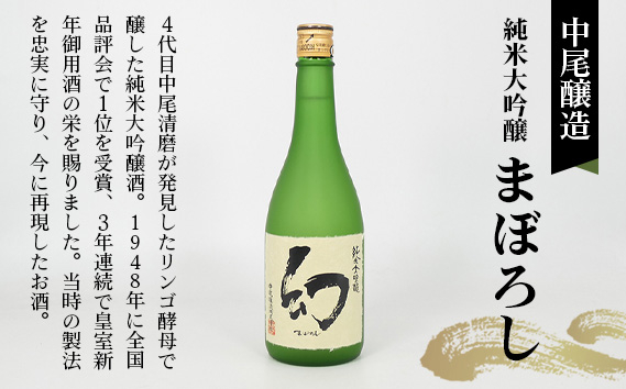 4代目中尾清磨が発見したリンゴ酵母で醸した純米大吟醸酒。1948年に全国品評会で1位を受賞、3年連続で皇室新年御用酒の栄を賜りました。当時の製法を忠実に守り、今に再現したお酒です。
