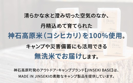 清らかな水と澄み切った空気のなか、丹精込めて育てられた神石高原米(コシヒカリ)を100%使用。キャンプや災害備蓄にも活用できる無洗米でお届けします。