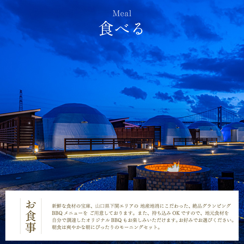 唐戸市場直送の食材をつかった“地産地消”絶品グランピング BBQを楽しめます。唐戸市場から車で5分の好立地で周辺観光も充実しています。