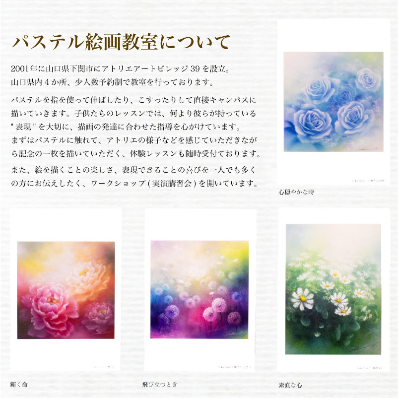 アトリエを拠点に、山口県内4か所で絵画教室を行っており、アートセラピーの概念を基本に、心身の癒しを目的に、アートと福祉の融合を目指しています。