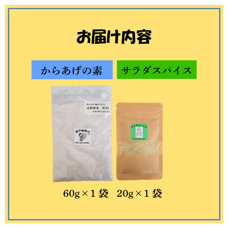【スパイス2種セット】 からあげの素&サラダスパイス  ( 唐揚げ から揚げ からあげ 唐揚 唐戸唐揚げ 米 米粉 サラダ 野菜 鶏肉 ドレッシング 調味料 香辛料 スパイス セット 唐辛子 グルテンフリー 塩 胡椒 にんにく オールスパイス 岩塩 和食 中華 下味 料理 調理 簡単調理 ) 下関 山口