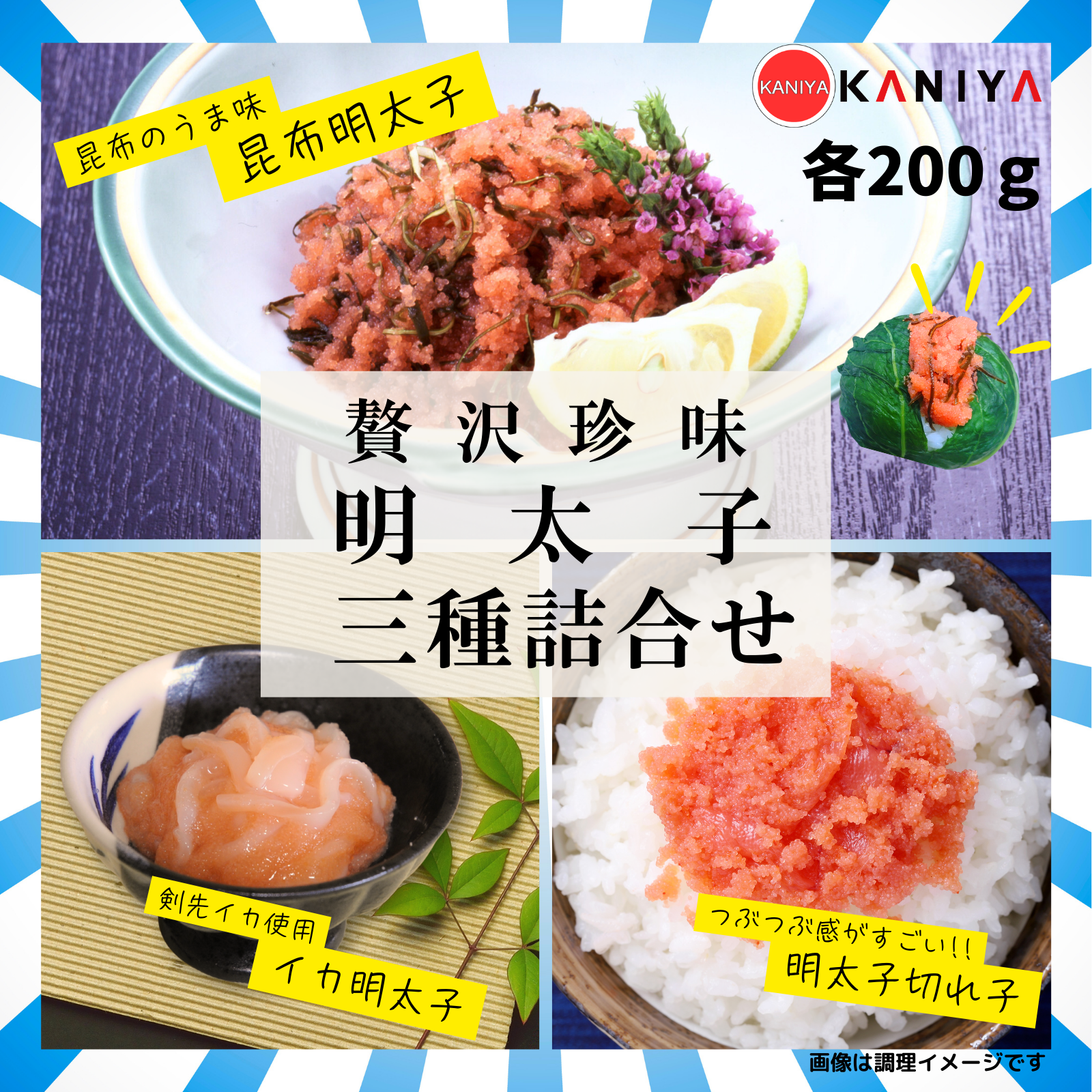 夕飯の一品にいかがですか? 明太子 計 600g 辛子明太子 切れ子 昆布明太子 いか明太子 各 200g セット めんたいこ いかめんたい きれ子 ご飯 お供 蟹屋 KNY-ME-200gmix 下関 山口