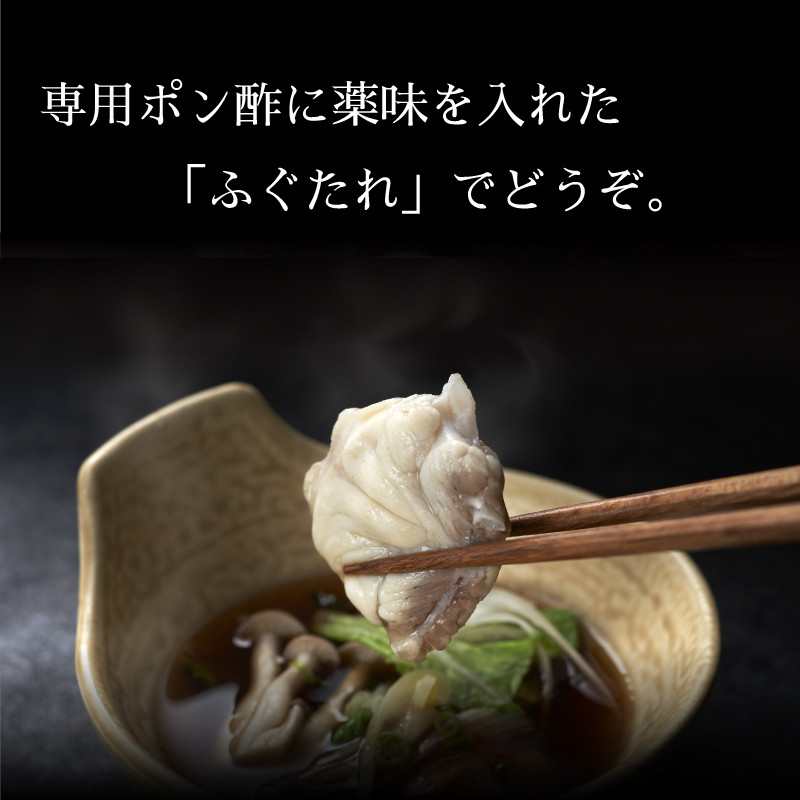 専用ポン酢に薬味を入れた「ふぐたれ」でどうぞ。