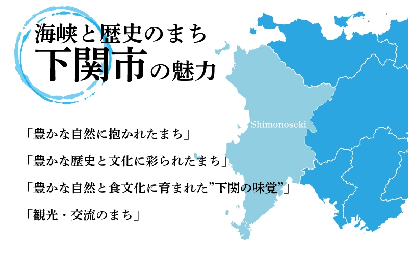 本州最西端に位置し三方を海に開かれた下関市は、自然と歴史に恵まれた「海峡と歴史のまち」です。