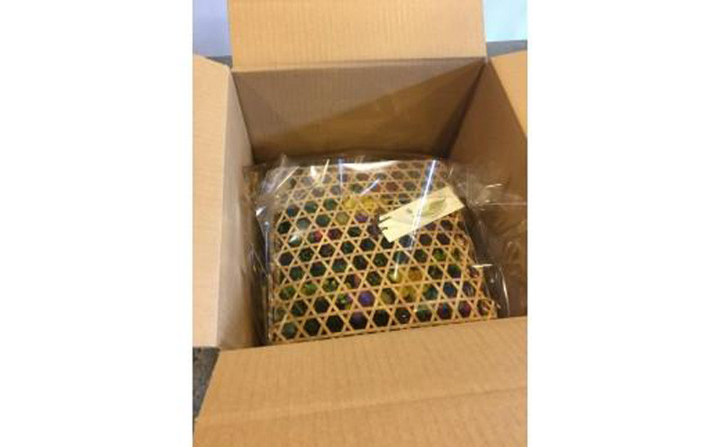 季節の花、様々な色、形、質感の花や葉物を四角い竹篭の中にお弁当風にデザインしました。
