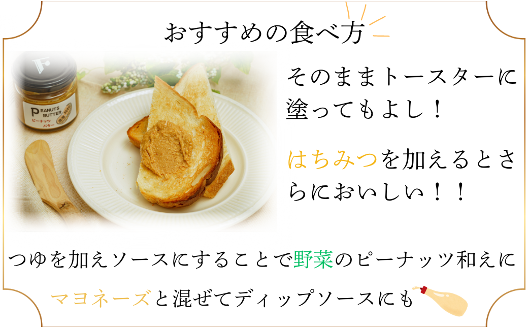 ピーナッツを食べるように、ピーナッツバターをパンや和え物にして食べていただくことで、体に必要な良質の油を取っていただけます。
