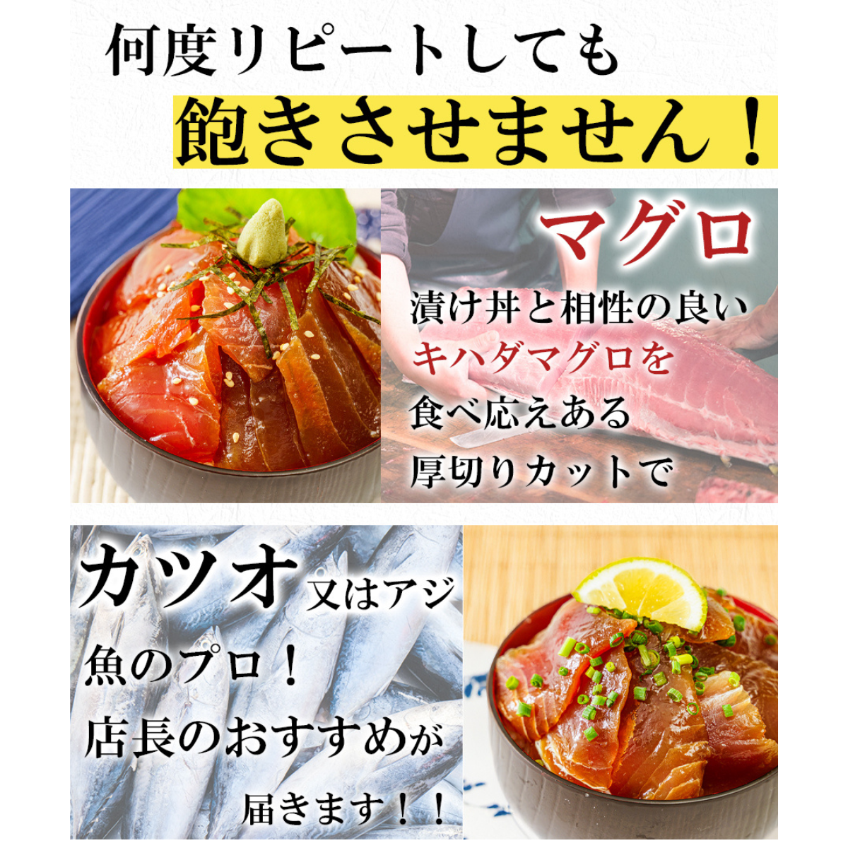 地域に愛される鮮魚店としてひたすら真面目に営業しています。魚屋の熟練された目利きによりその時一番いい新鮮な魚を選び、全国に発送しております。リピーター続出の魚かつ漬け丼セットはたくさんのレビューもいただいておりますのでぜひ一度ご賞味ください!