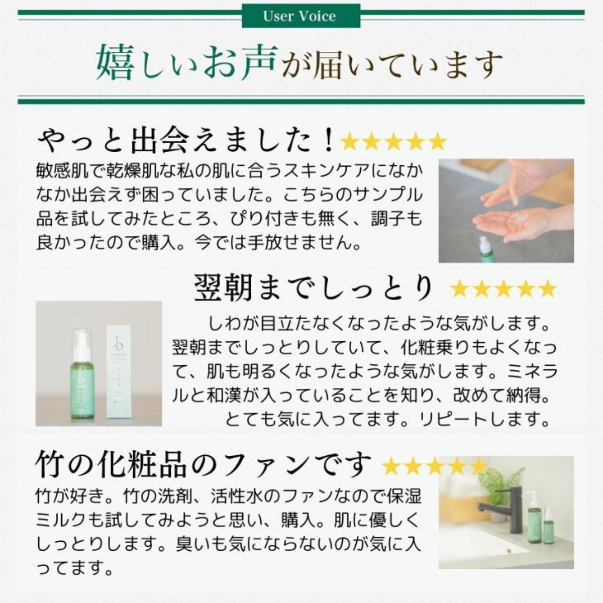 国産の天然成分+合成香料など全て不使用。敏感肌の方も安心して使えるスキンケアです。山口県産孟宗竹を使用。誰も手を付けず大自然で育った竹は無農薬で自然原料そのもの!独自の製法により肌に良いとされるミネラルを抽出し、スキンケアを開発しました。さらに、日本の風土に合った6つの和漢エキスを配合することで、敏感肌の方も安心して使える高保湿でエイジングケアと紫外線ケアを叶えました。