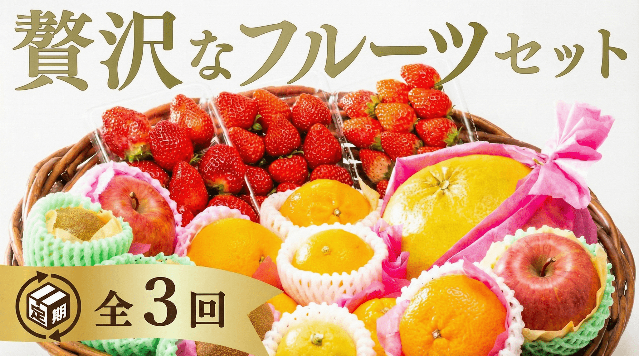 毎回、3 種類以上のフルーツを詰め合わせてお届けします。お申し込み後に、下記ラインナップの中からお好きなフルーツを合計3 つおえらびいただけます(※1 回につき1 つを選択× 3回分のイメージ)。さらに、毎回の内容がもっと楽しみになるように、残りの2 種類はその時期の旬のフルーツをおまかせで追加してお届けします。