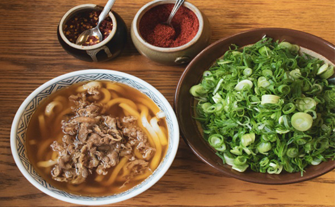 特徴は山陰地方特有の甘めのうどんだしに、とろモチっとした食感の麺。さらに甘辛い味付けの牛肉がだしにコクを加えます。うどんだしは一晩水につけこんだ利尻昆布にじっくりと火入れをして作ります。うどんの麺は小麦粉と塩と萩の水のみを使い、一切混ぜ物はございません。もちろん保存料は無添加です。