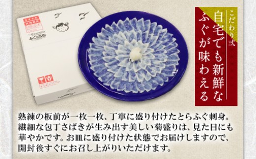 ふぐの中でも最高級魚とされるトラフグ(山口県産・養殖)の刺身・ふぐちり鍋・ひれ酒をお楽しみいただけます。ご希望日に合わせて自社いけすよりトラフグを水揚げし、調理・発送いたします。新鮮なトラフグならではの濃厚な旨みと弾力をご堪能下さい。