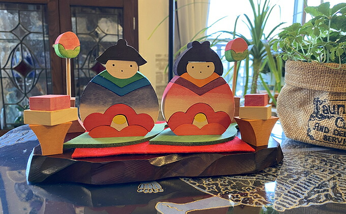 日本の野山に早春から紅い花を咲かせ、春を告げてくれる椿は、萩市の花としても愛されています。この椿の衣装をまとった、ほのぼのと可愛らしい木製のおひな様です。人形や調度品が一つの箱にすべて収まる組み木のひな人形は、コンパクトで場所をとりません。節句のお祝いにも最適です。