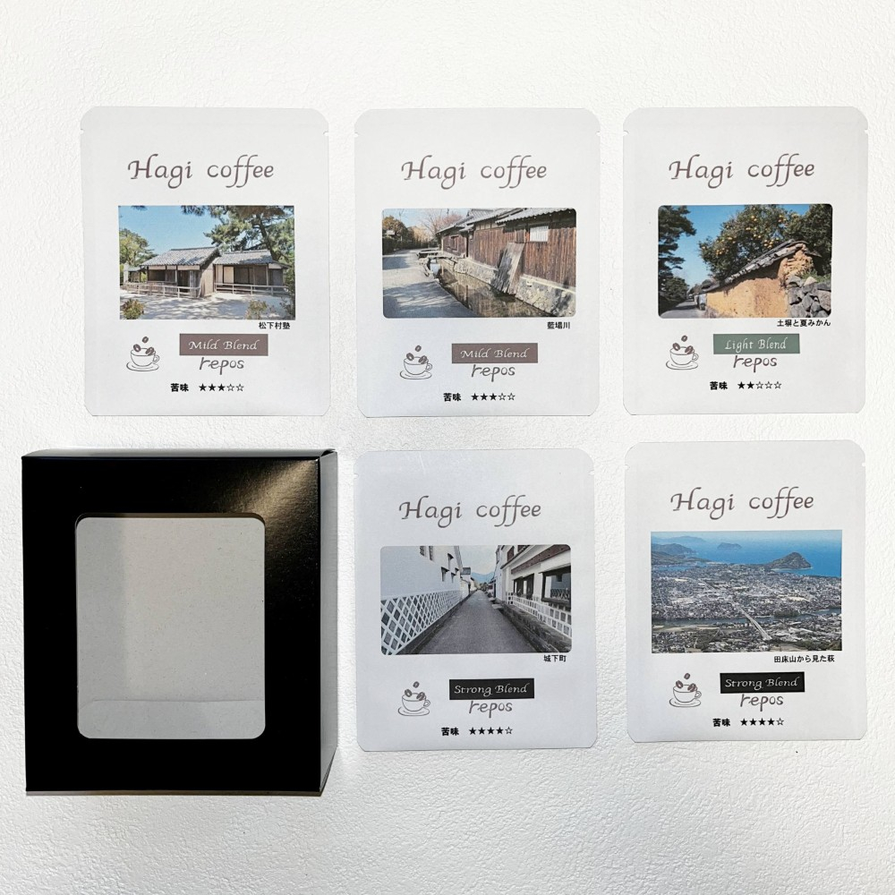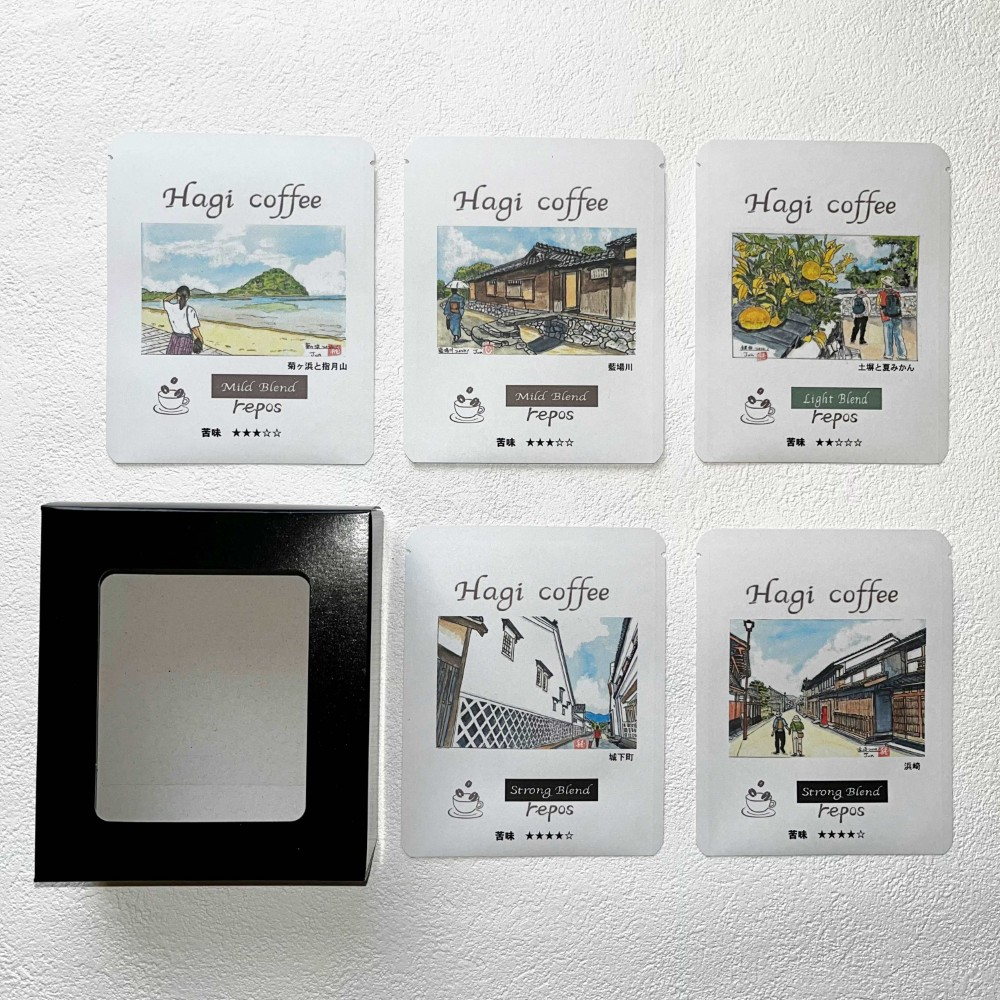 この商品はその中でも有名な松陰神社、城下町、浜崎、藍場川、土塀と夏みかんなど萩観光地の写真とイラストをパッケージにしたコーヒードリップバッグの詰め合わせセットです。