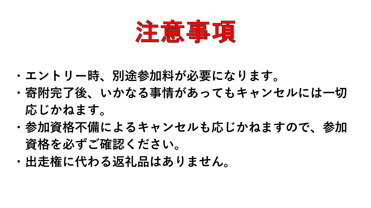 ※寄附後の返金は一切できませんので、ご了承ください(出場資格を満たしていない場合や、大会の中止が決定した場合においても、返金等は一切できません)。