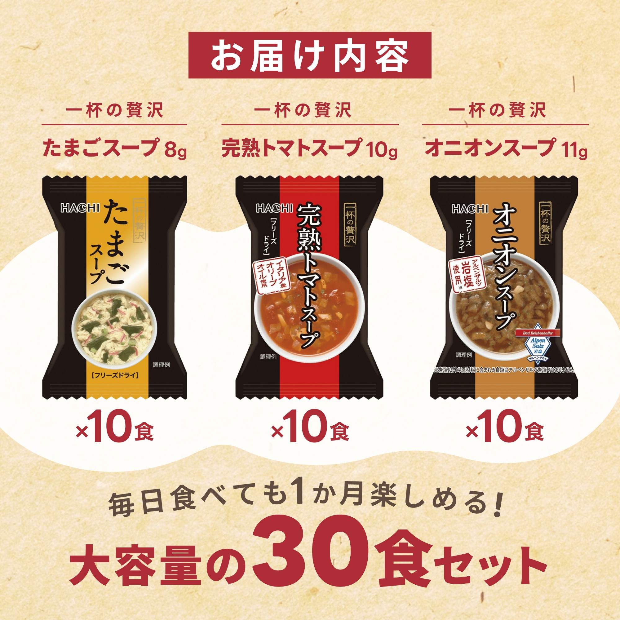 | 容量 | 30食 [原材料名] 【一杯の贅沢 たまごスープ】 鶏卵(国産)、チキンエキス、デキストリン、スープベース(デキストリン、砂糖、調味チキンパウダー、たん白加水分解物、その他)、食塩、でん粉、しょうゆ、こんぶエキス調味料、米醸造調味料、しいたけエキス調味料、砂糖、具(かまぼこ、わかめ、ねぎ)/調味料(アミノ酸等)、酸化防止剤(ビタミンE)、ベニコウジ色素、カロチン色素、(一部にかに・小麦・卵・乳成分・牛肉・大豆・鶏肉・豚肉・ゼラチンを含む) 【一杯の贅沢 オニオンスープ アルペンザルツ岩塩使用】 ミート香味調味料(たん白加水分解物、ポークエキス、還元水あめ、その他)、乳糖、チーズ、バター、野菜エキス、コンソメ粉末、でん粉、濃縮がらスープ、デキストリン、岩塩、酵母エキス、砂糖、醸造調味料、おろしにんにく、香辛料、具(ソテーオニオン(国内製造)、フライドガーリック、パセリ)/調味料(アミノ酸等)、カラメル色素、増粘剤(タマリンドシードガム)、酸化防止剤(ビタミンE、チャ抽出物)、酸味料、(一部に小麦・乳成分・牛肉・大豆・鶏肉・豚肉・ゼラチンを含む) 【一杯の贅沢 完熟トマトスープ イタリア産オリーブオイル使用】 トマトペースト、食塩、乳糖、スープベース、野菜エキス、濃縮がらスープ、チーズ、オリーブオイル、でん粉、砂糖、デキストリン、たん白加水分解物、おろしにんにく、酵母エキス、香辛料、具(トマト(イタリア)、ソテーオニオン、キャベツ、鶏肉、フライドガーリック、パセリ)/調味料(アミノ酸等)、増粘剤(タマリンドシードガム)、pH調整剤、酸化防止剤(ビタミンE、チャ抽出物)、(一部に小麦・乳成分・牛肉・大豆・鶏肉・豚肉を含む) |