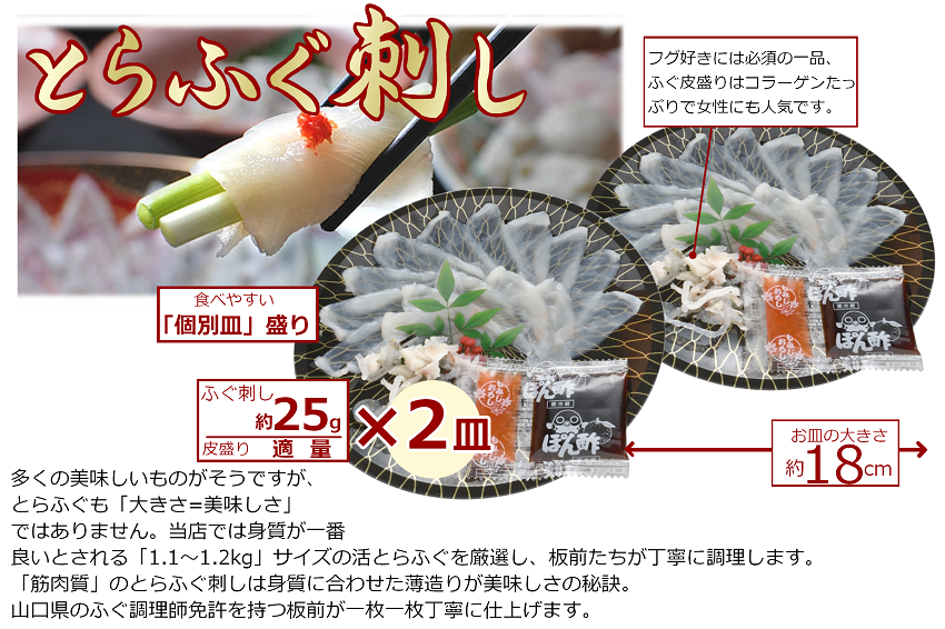 | 容量 | ・とらふぐ刺身 約50g(25g×2皿) ・とらふぐ皮 約30g(15g×2) ・ポン酢・赤おろし ・ふぐの天ぷら(6枚) ・風呂敷、専用化粧箱 |