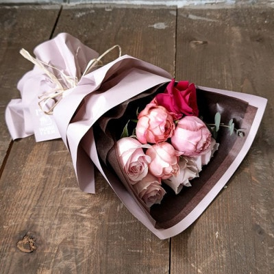 栽培しているピンク系の品種の中より、その時一番のおすすめのバラを摘み取りキュートなピンク系のブーケに仕立てます。