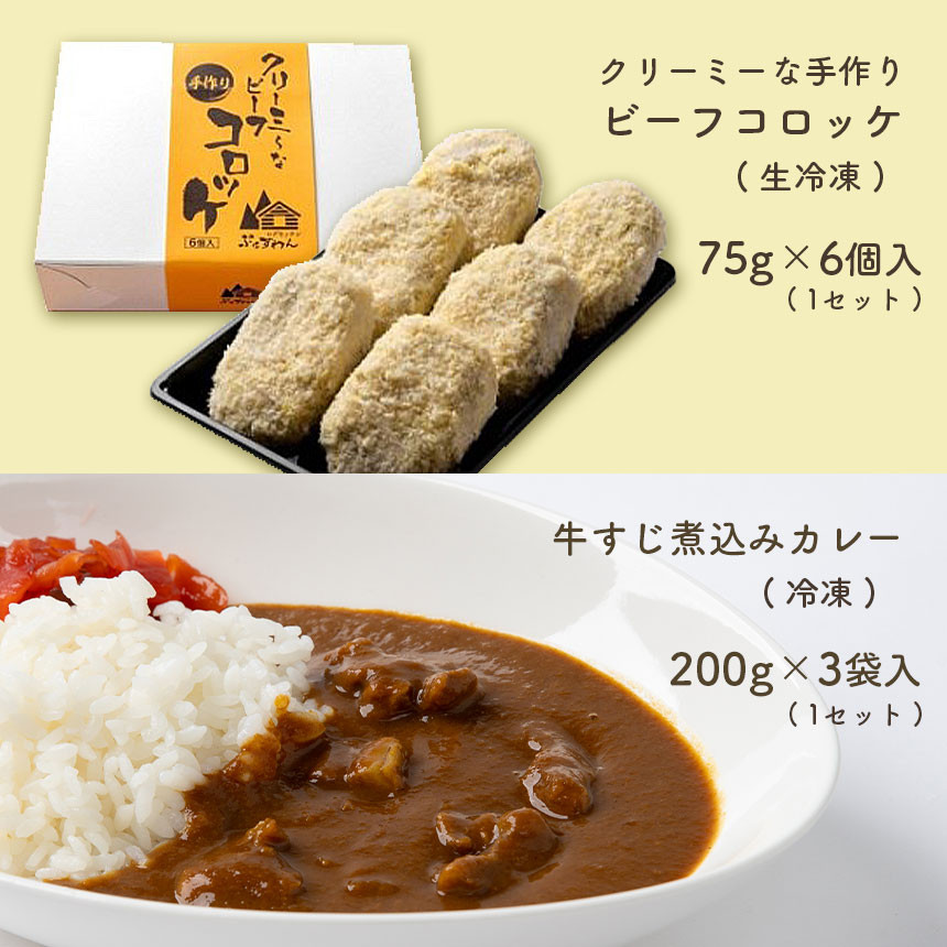 チョイスPayポイントと交換できる品 凝縮した牛肉の旨みを味わう 手作り ビーフコロッケ(生)&牛すじ煮込みカレー 【冷凍】 | コロッケ 牛肉 クリーミー カレー 牛すじ 野菜 煮込み 惣菜 セット 詰め合わせ 冷凍 食品 特産品 山口 美祢市 美祢