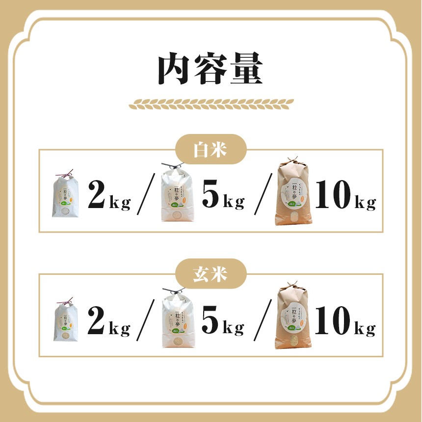 | 容量 | 白米 ヒノヒカリ 2kg / 5kg / 10kg 玄米 ヒノヒカリ 2kg / 5kg / 10kg |