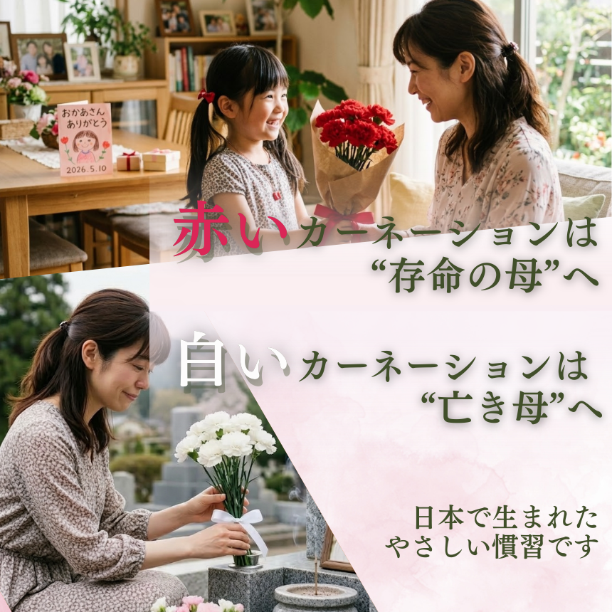 「国産カーネーションで日本中に彩りとうるおいをあたえたい」――そんな想いを込めて、一本一本を大切に育てています。母の日に贈る「ありがとう」の気持ちが、花とともにまっすぐ届くように、切り花のお手入れガイドと切花延命剤もお付けしています。令和8年4月1日から受付を開始し、令和8年5月6日まで受付。令和8年5月10日の母の日までに、ご指定先へお届けします。