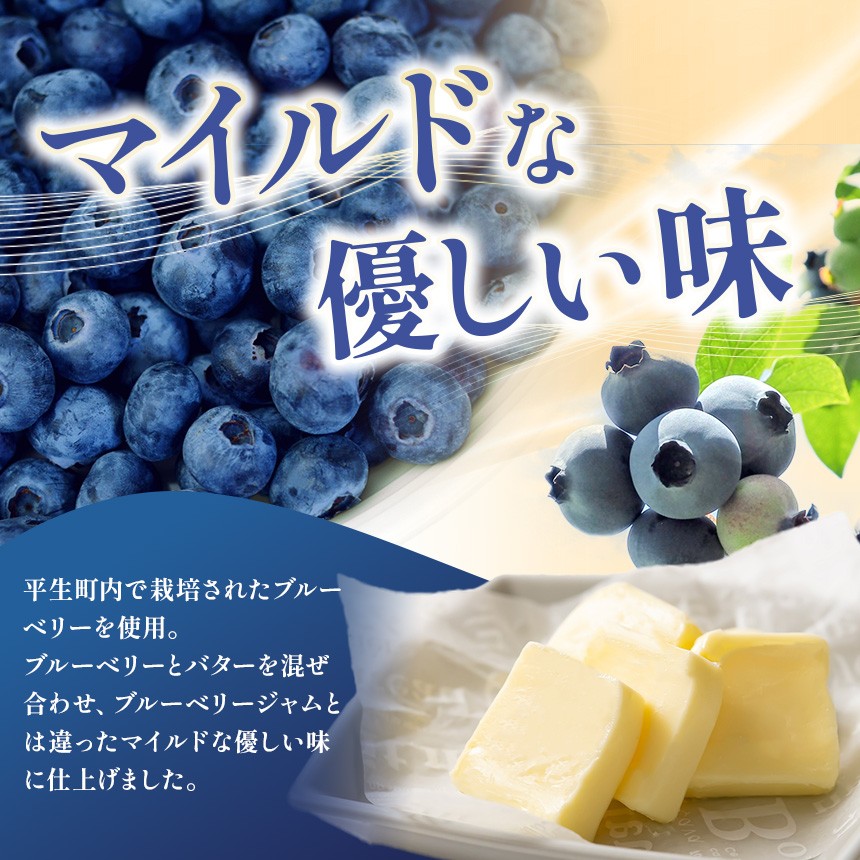 ブルーベリーバターは、地元・平生町で育った新鮮なブルーベリーとバターを絶妙にブレンドした一品。ブルーベリージャムよりもまろやかで優しい甘さが特徴で、トーストやスコーン、ホットケーキなどに塗ってご堪能ください。