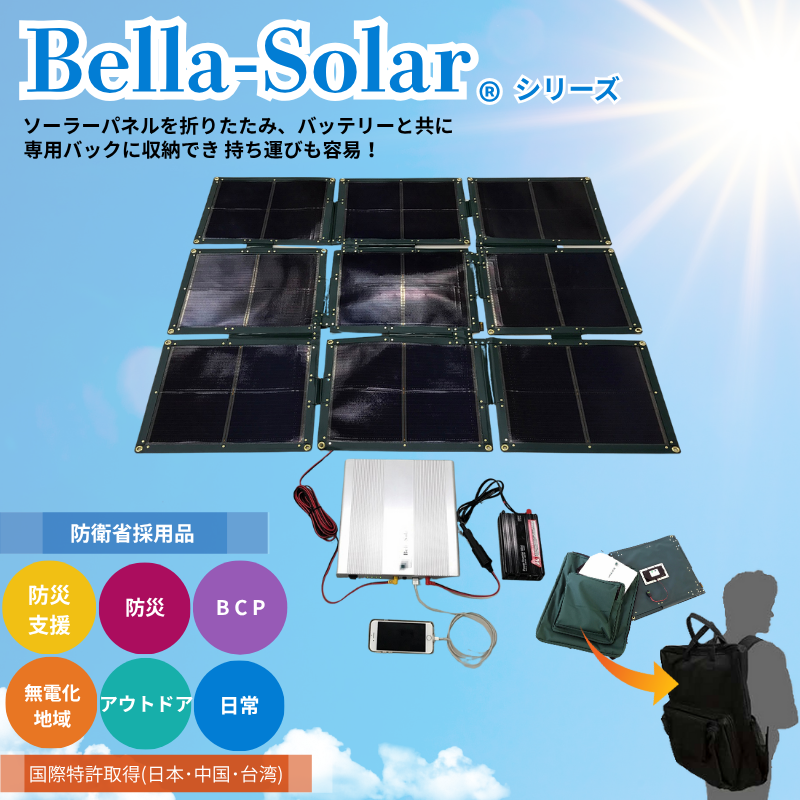 いつでも、どこでも、誰でも使える。防災時に活用できる軽くて持ち運びできるソーラーパネルと蓄電池のセット。専用のリュックサックに収納でき簡単に持ち運べます。過酷な条件(夏場や氷点下)でも発電。雨への耐水性も配慮していますので、災害時、電気が止まってもどこでも安心して使用していただくことができます。