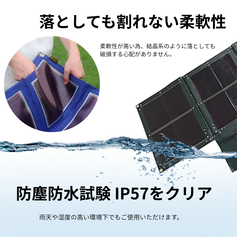 いつでも、どこでも、誰でも使える。防災時に活用できる軽くて持ち運びできるソーラーパネル。ソーラーパネルから直接スマホへの充電が可能な為、安否確認などの貴重な情報を途絶えさせません。また専用の蓄電池への充電もできる2WAY仕様。災害時、電気が止まってもどこでも安心して使用していただくことができます。
