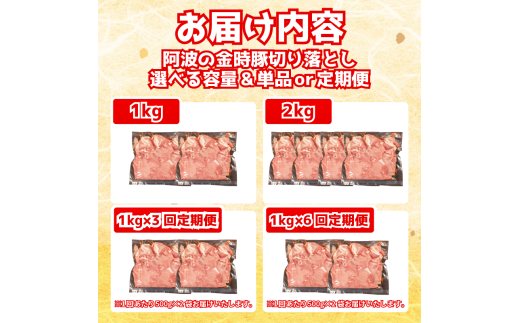 容量 | 下記より、お選びいただけます。 【単品】金時豚切り落とし1kg(500g×2) 【単品】金時豚切り落とし2kg(500g×4) 【定期便】金時豚切り落とし1kg(500g×2)×3回定期便 【定期便】金時豚切り落とし1kg(500g×2)×6回定期便 |