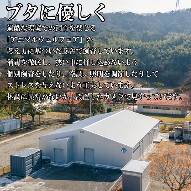 ・徳島大学生物資源産業学部 石井農場にある飼育豚舎で育てました。動物福祉に対応しており、⼀頭⼀頭愛情込めて育てました。
