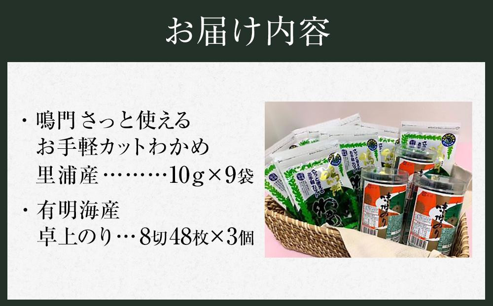 | 容量 | 鳴門さっと使えるお手軽カットわかめ里浦産10g×9 有明海産卓上のり8切48枚×3 |