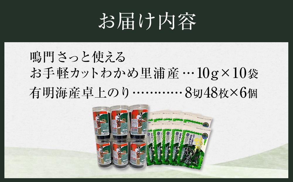| 容量 | 鳴門さっと使えるお手軽カットわかめ里浦産10g×10 有明海産卓上のり8切48枚×6 |