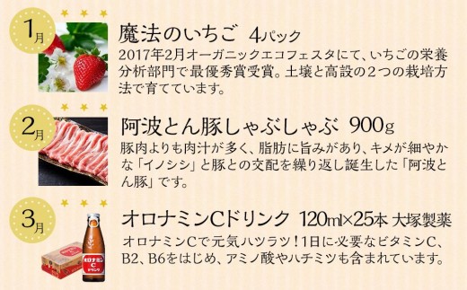 容量 | 【1月】さちのかいちご 1パック270g以上×4パック 【2月】阿波とん豚 しゃぶしゃぶ 900g 【3月】大塚製薬 オロナミンCドリンク120ml×25本(1ケース) 【4月】ボンカレーゴールド(中辛)30個 【5月】鳴門産カットわかめ (14g×8pc) 【6月】大野海苔8切48枚×4本(板のり24枚分)(ギフト箱入り) 【7月】 ・天然酵母パン(ベーグル・マフィン・食パン・カンパーニュ・フォカッチャなど全80種から6つ前後) ・焼菓子(バターケーキ・タルト・クッキー・ラスク・グラノーラなど全17種から2つ前後) 【8月】なると金時1箱(5kg) 【9月】露地すだち1箱(1kg) 【10月】トウダイの肉ラーメン×5食(1食 スープ330g、豚スライス50g、麺140g) 【11月】天然鳴門鯛鯛しゃぶセット(3~4人前) <セット内容> 天然鳴門鯛の切身(鯛しゃぶ用) 約400g 季節の鍋野菜一式 約10種類 薬味(すだち等) 天然鳴門鯛の頭など出汁用のアラ 特製ストレート出汁パック 500ml 【12月】阿波牛モモすき焼き肉 600g |