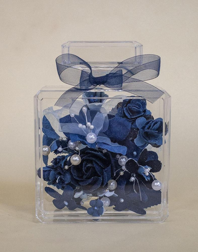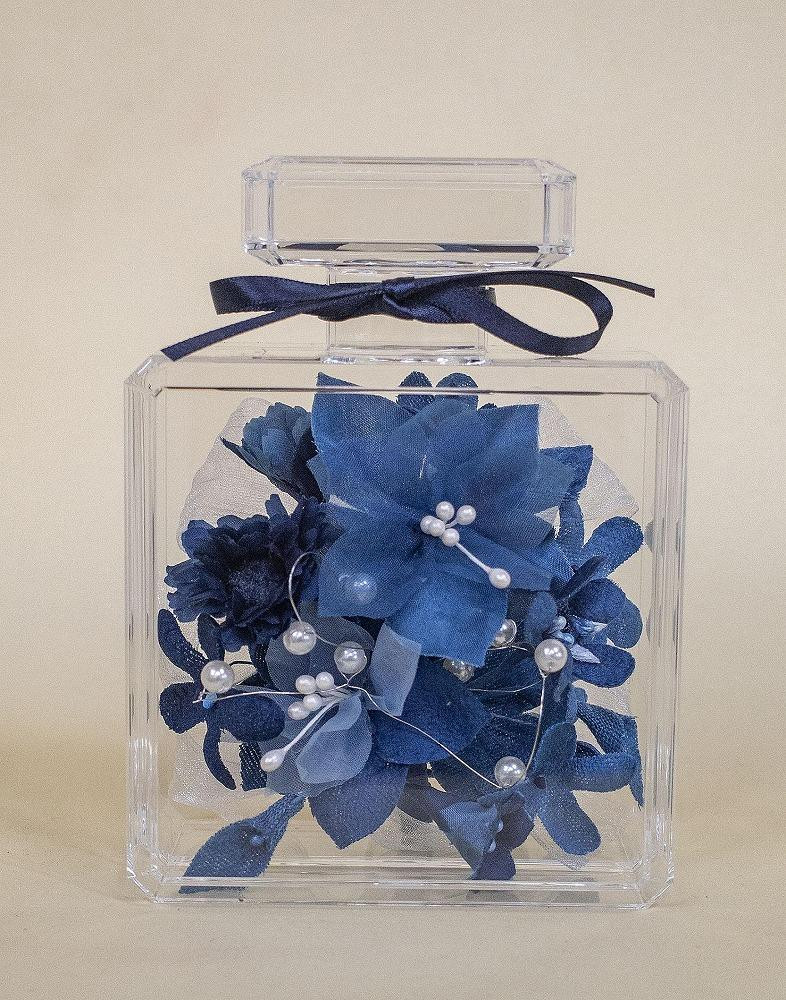 本藍染で染めた布で一つ一つ丁寧に作った花をアクリルの香水瓶の中にデザインした商品です。結婚お祝いやあらゆるお祝いに最適です。