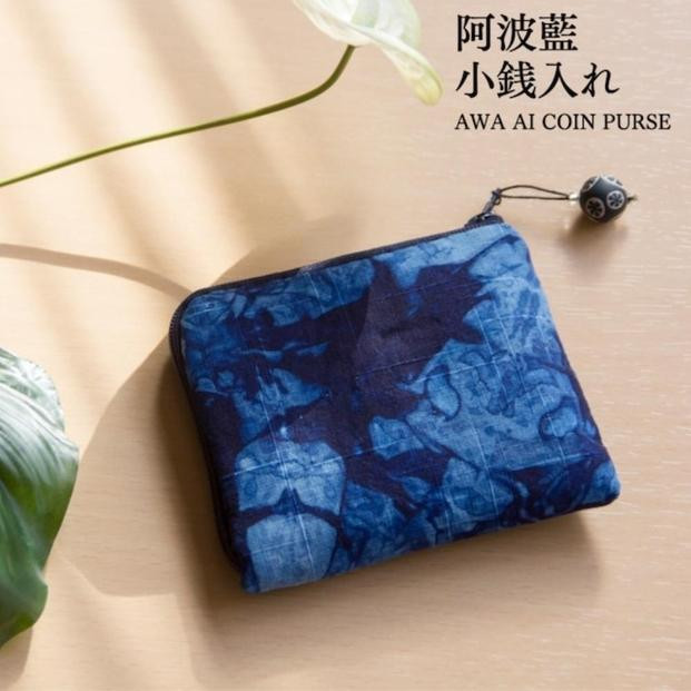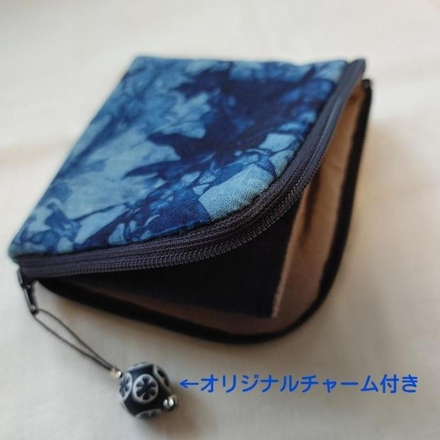 本藍染矢野工場にて藍染作家、矢野藍秀氏が丁寧に染め上げた生地を使用。綿100%=箱ろうけつ染め。熟練職人が丹精こめて作った小銭入れにはオリジナルチャームがついています。