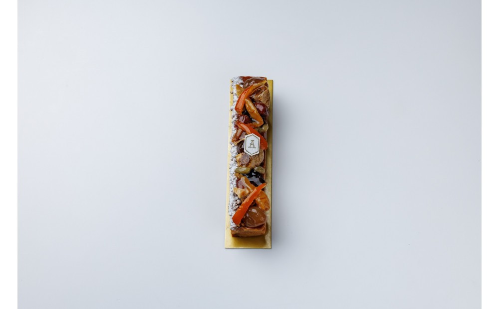 マロングラッセを使用し、洋梨やプルーン、イチジクなど秋をイメージしたドライフルーツをたっぷり入れて焼き上げたケークと、阿波和三盆糖のバタークリームをはさんだ上品な風味のダックワーズの詰め合わせです。