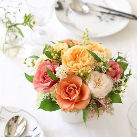 「王道のローズアレンジは最新デザインにアップデート!」 オレンジとピンクのコンビは誰からも愛される組み合わせ。可愛らしさも、柔らかな女性っぽさも兼ね備えたローズだけのアレンジ。 王道のスタンダードローズに加え、カップ咲きローズ、新色を使用し、気分が上がる贅沢なデザインにアップデートしました。 オールラウンドなので、どこから見ても綺麗な仕上がりで、優しくて柔らかな配色がお部屋を華やかに演出します。