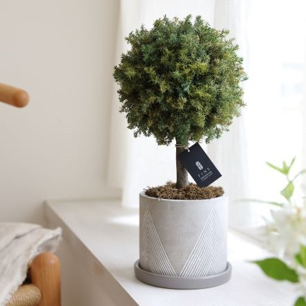 プリザーブドフラワー グリーンボールトピアリー30,000 円 開店当初より販売を続けているロングセラー商品を、北欧デザインのインテリアやシンプルインテリアに似合うグレーの花器にリニューアル。 社内で1つ1つ丁寧に手作業で仕上げたオリジナル商品です。 - 常温便