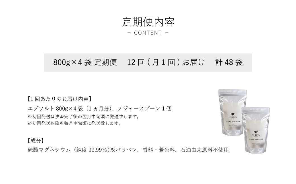 | 容量 | 800g×4袋 定期便 12回お届け 計48袋 【1回あたりのお届け内容】 エプソルト800g×4袋(1ヵ月分)、メジャースプーン1個 【成分】 硫酸マグネシウム(純度99.99%)※パラベン、香料・着色料、石油由来原料不使用 |