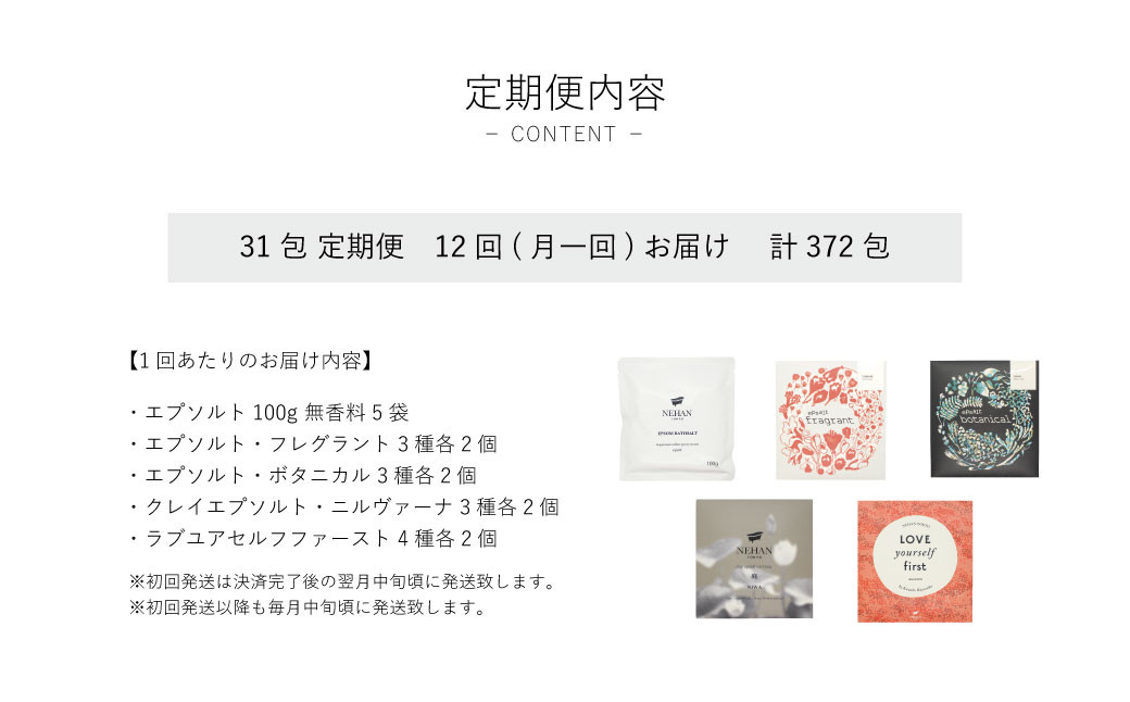 | 容量 | 31袋 定期便 12回お届け 計372袋 【1回あたりのお届け内容】 ・エプソルト100g 無香料 5袋 ・エプソルト・フレグラント 3種各2個 (プラム/チュベローズ/サンパギータ) ・エプソルト・ボタニカル 3種各2個 (ユズ/ヒノキ/ムスク) ・クレイエプソルト・ニルヴァーナ 3種各2個 (寺/庭/桜) ・ラブユアセルフファースト 4種各2個 (spring/summer/autumn/winter) |