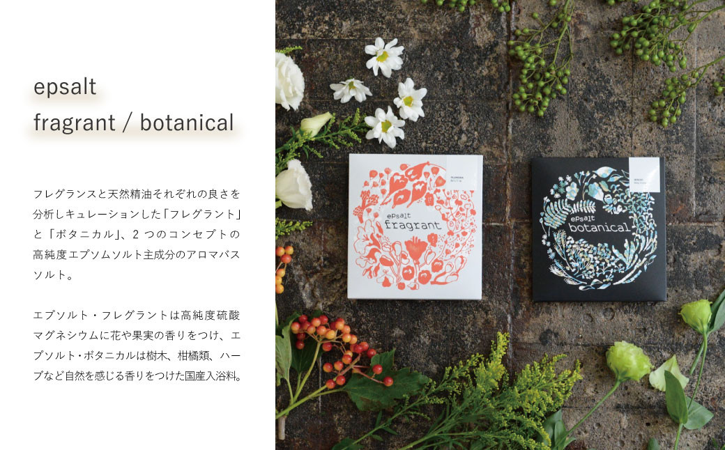 エプソルト・フレグラントは高純度硫酸マグネシウムに花や果実の香りをつけ、エプソルト・ボタニカルは樹木、柑橘類、ハーブなど自然を感じる香りをつけた国産入浴料。ひとつひとつ手作業で紙製パッケージに包まれたバスソルトです。