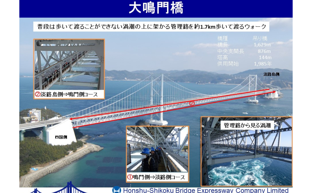 普段は歩くことのできない大鳴門橋の管理路を歩いて、眼下に渦潮を見ることができる特別な体験です。