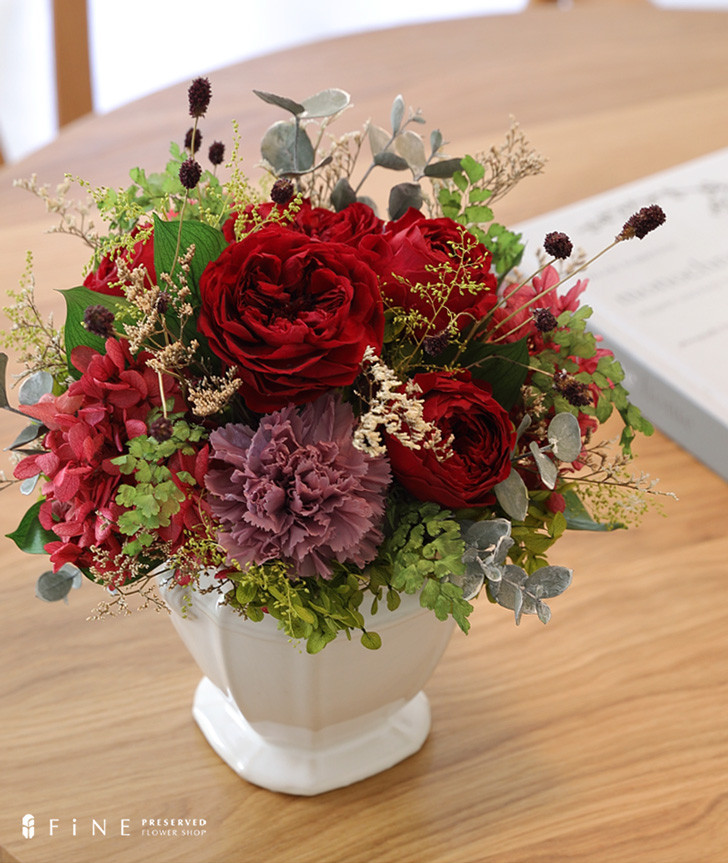 大人のレッドとアンティークパープルの組み合わせで叶う、いまどきアンティークアレンジメント。 フレッシュなグリーンと小花をふんだんに配することで、どんなインテリアに馴染みます。 素材:ローズ、カーネーション、アジサイ、グニーユーカリ、ルスカスガーデン、アジアンタム、シャワーグラス(プリザーブド)カスピア、ワレモコウ(ドライ) ※ワレモコウのドライフラワーは、大変繊細です。 先端部分がポロポロと落ちることがあります。 花落ちが気になる場合は、取り除いて飾って下さい。