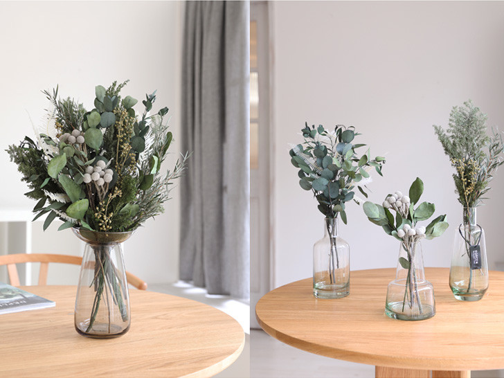 お手入れ不要の観葉植物 あったらいいなを形に・・・ まだまだ続く、空前のインテリアグリーン人気。 今まで植物を育てた経験のない方も、ついつい手がでる観葉植物ですが、皆さん1鉢、2鉢…気が付いたら枯れてしまい、挫折してしまう方も。 そんな方に是非知って頂きたい!枯れない観葉植物の存在。 本物のグリーンをブリザーブド加工し、まるで生きているかのように、お手入れ不要で数年は愉しんで頂けるのです。 日々忙しくて、グリーンを育てることができない方や、日当たりが悪くて育たない環境にもピッタリ。 素材に合わせた、今までにない個性的な器。 ゴツゴツとしたワイルド系、スタイリッシュなセメントの花器、清潔感のあるスッキリ系、温もりを感じるほっこり系等々。 テイストが異なる器もグリーンという共通のアイテムがあるだけで、どれを合わせても素敵です。 グレビレア・アイバンフォー、ユーカリ、ティーツリー、アセビ、モス、サリグナム、アイビー、イタリアンルスカス、山シダ、の中からお選びください。