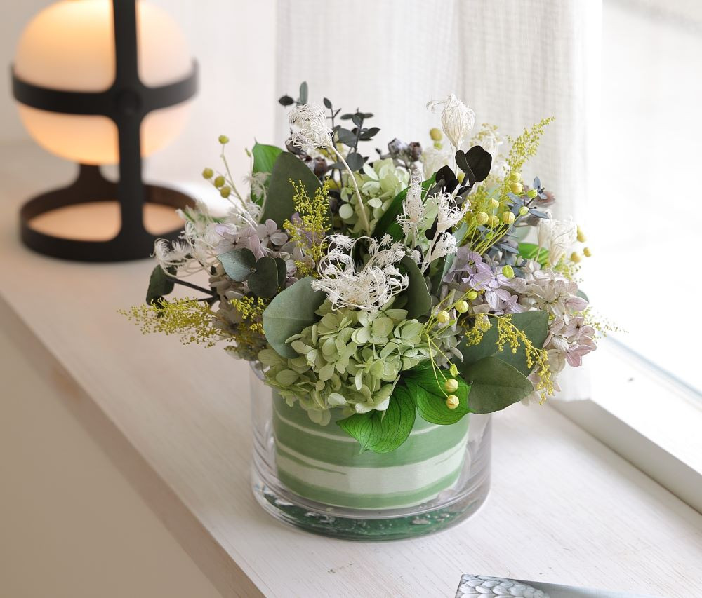 クリア感のあるグリーンアレンジはインテリアとしてはもちろん、リラックス効果も。