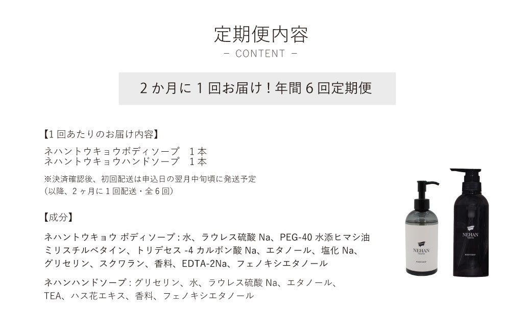 しっとり滑らか肌を演出するスペシャルなボディケアセット 【NEHAN TOKYO】ボディ&ハンドケア定期便 全6回 ボディソープ ハンドソープ しっとり うるおい セット