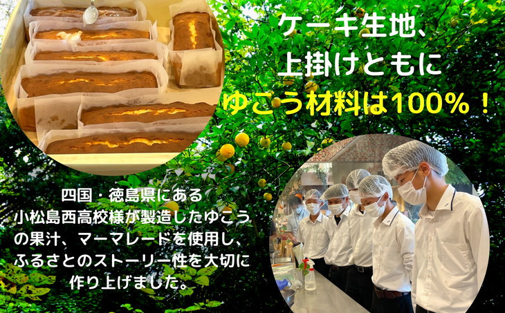 ケーキ生地、上掛け共にゆこう材料は100%で、小松島西高校様が製造したゆこう果汁、マーマレードを使用しており、ふるさとのストーリー性を大切にしております。