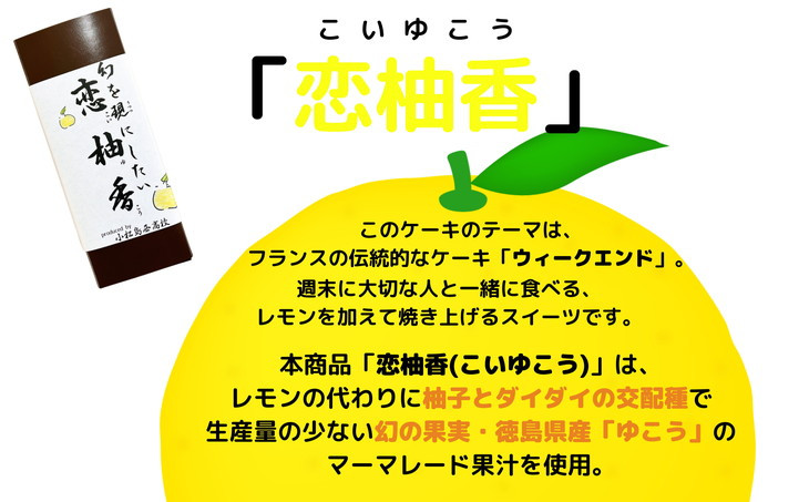 本商品「恋柚香(こいゆこう)」は、レモンのかわりに柚子とダイダイの交配種で生産量の少ない幻の果実、徳島県産「ゆこう」のマーマレード、果汁を使用しまろやかで豊かな風味お楽しみにいただけるケーキに焼き上げました。柔らかな酸味と共にピールの食感、ほろ苦さもお楽しみ頂けます。