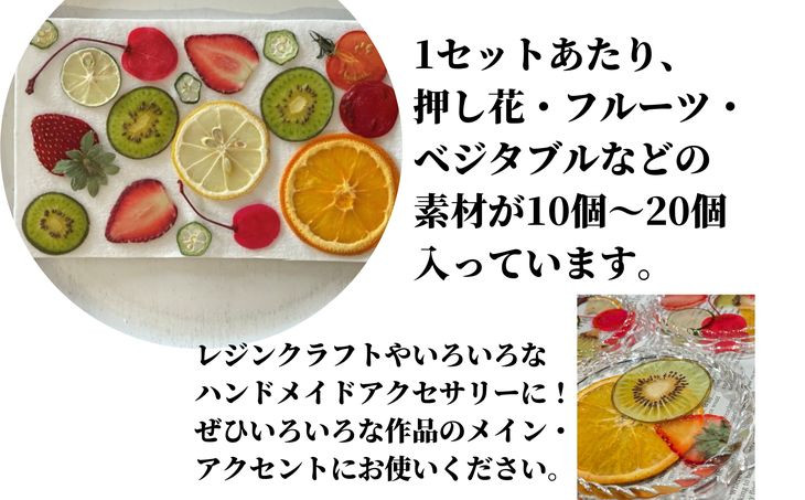 1セットあたり、押し花・フルーツ・ベジタブルなどの素材が10個~20個入っています。
