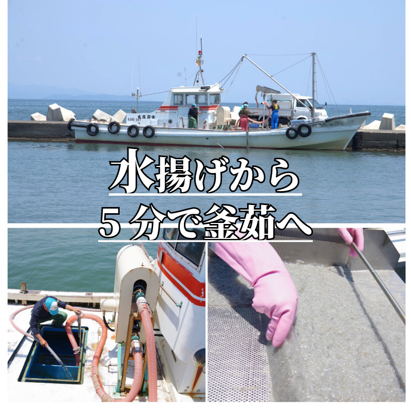 美味しさの秘密は水揚げから5分以内に釜揚げにすること。ゆで方も100℃で2分と、高温かつ短時間でゆでることで、しらすの形そのまま、プリッとした食感に仕上がります。また、カルシウムやDHAやミネラル、EPAなどの栄養素も豊富に含まれており、まさに栄養の宝庫といえるしらすとなっております。