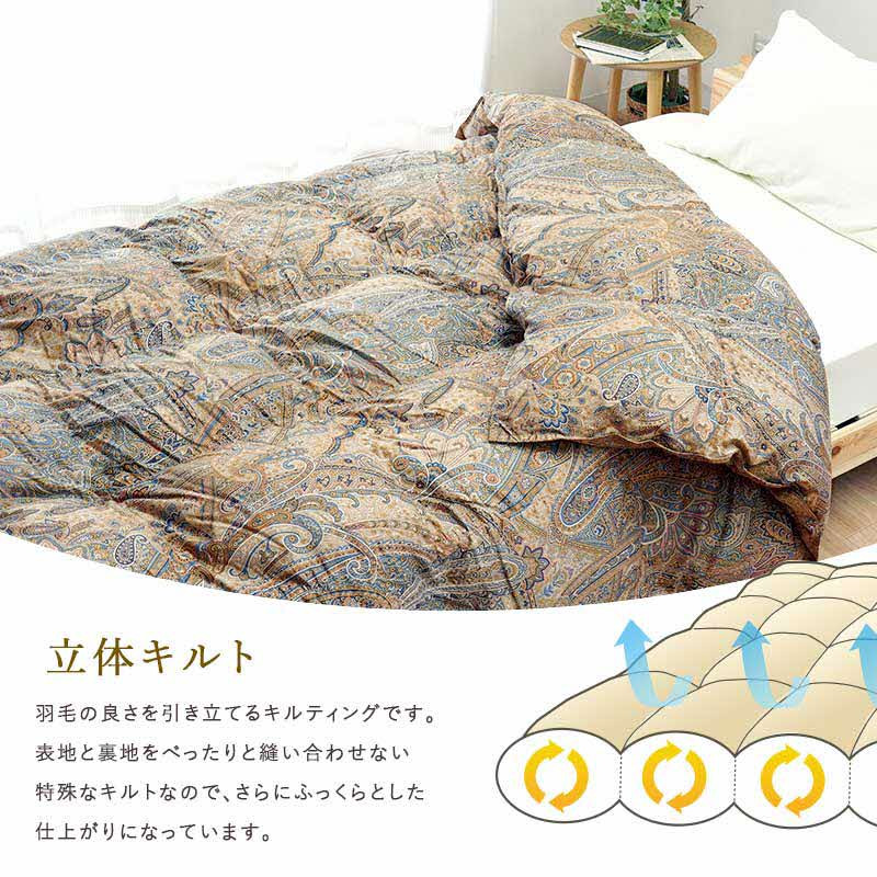 羽毛が本来持つ膨らむ力を発揮するため、布団内に羽毛の小部屋を立体的に作ったキルトです。ふっくらと膨らんだ布団は、あたたかい空気をふんだんに含みますのであったかくお休み頂けます。